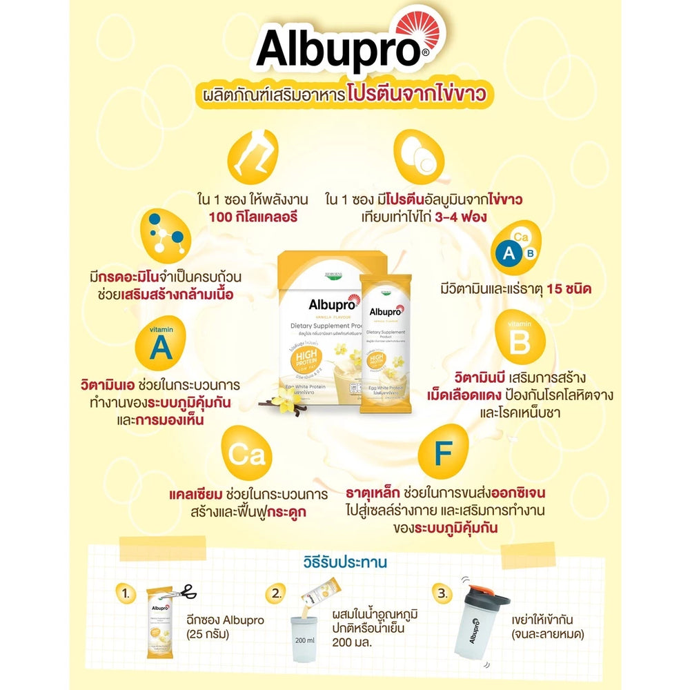 Tear open one sachet of Albupro (25 grams) and mix with 180-200 ml of room temperature or cold water (do not mix with hot water and do not microwave). Shake well until completely dissolved. Take one sachet daily. Once opened, use it all at once. Directions: Once opened, use it all at once. Store in a cool, dry place. Take one sachet daily.